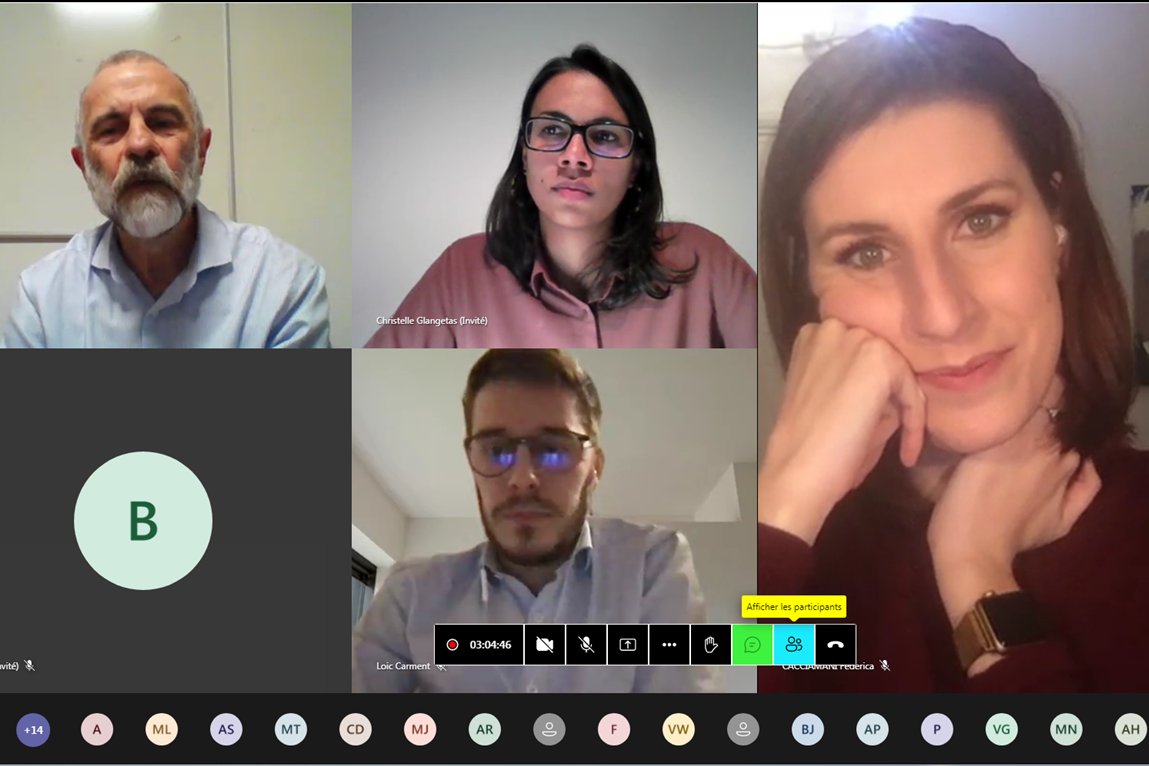 Sur la photo d'écran ci-dessous, de gauche à droite : le Dr Yves Tillet (INRAe) qui pilote la visioconférence, le Dr Christelle Glangetas, le Dr Federica Cacciamani et le Dr Loïc Carment.